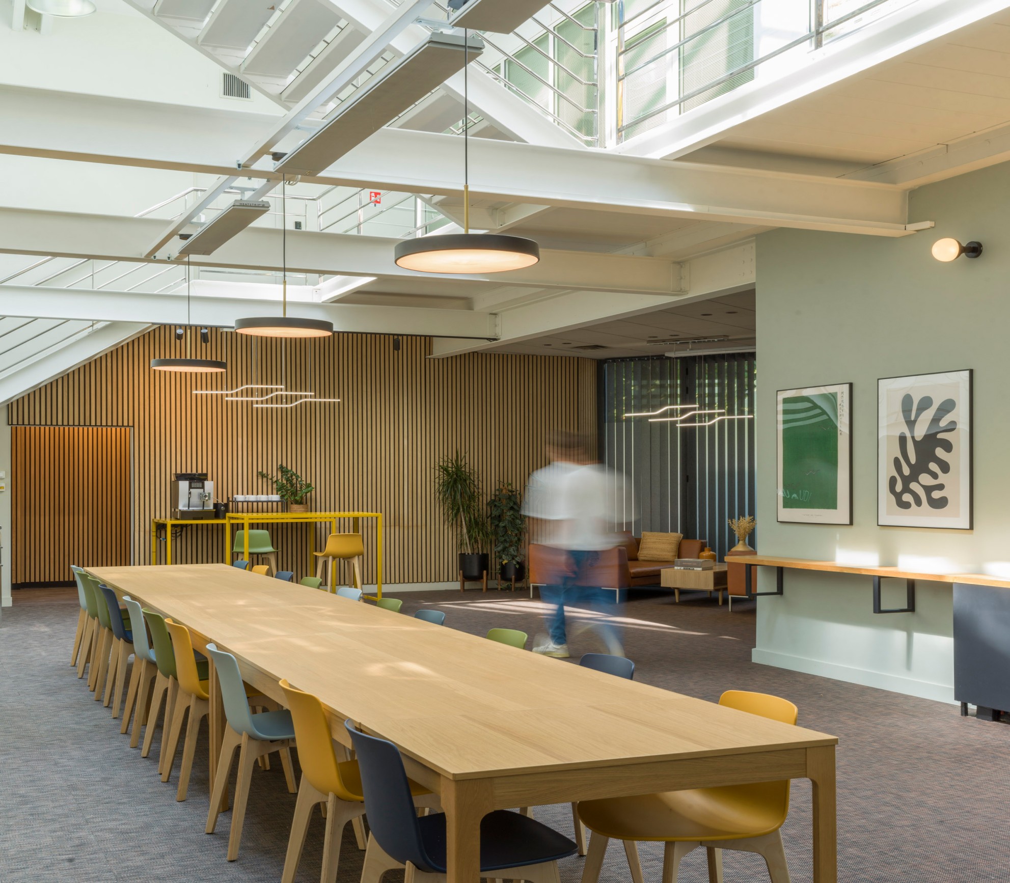 Dans un hall cathédrale, différents espaces vous accueillent sous une verrière centenaire. Espace café, linéaire de tables pour vos pauses déjeuner, cuisines équipées, terrasse extérieure.